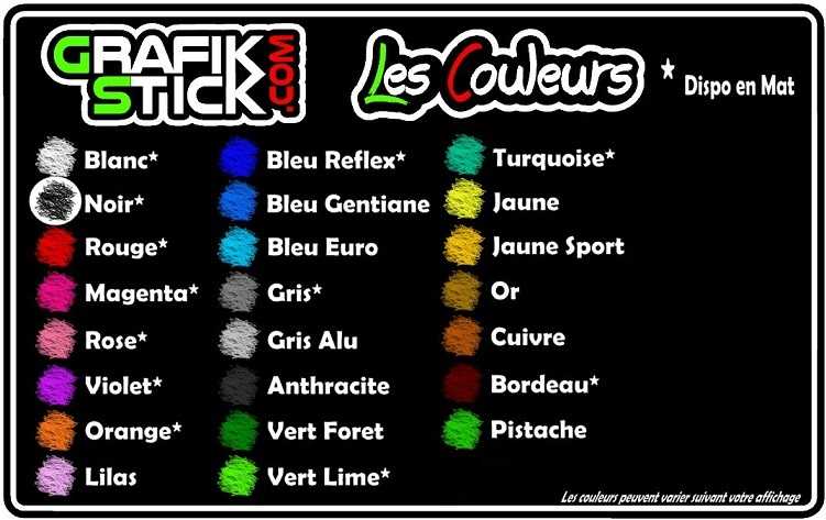 Si vous désirez une couleur Mat Présente dans la liste ci dessous, merci de nous l'indiquer lors de votre commande.